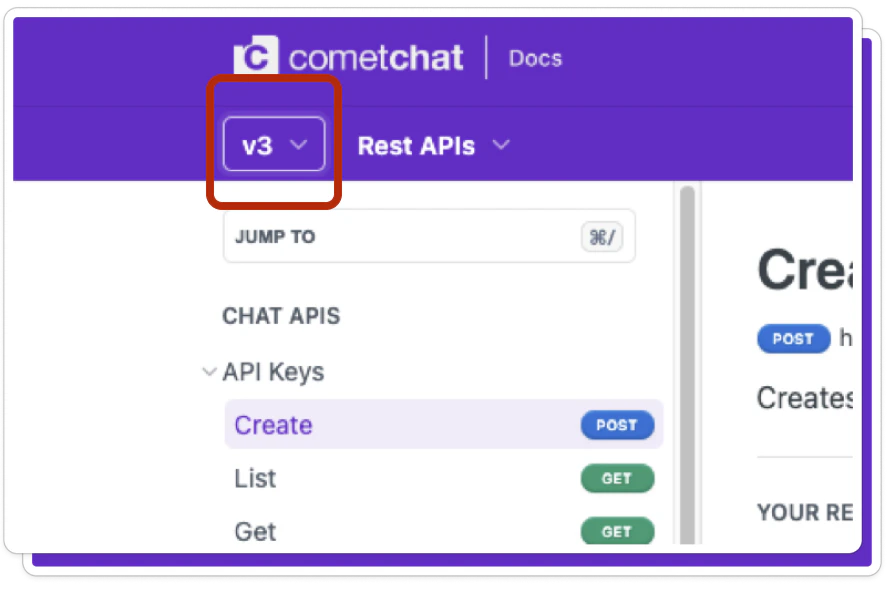 This step is only applicable if you are using CometChat Rest APIs. Go to Rest API documentation Make sure you have selected V3. Select and update the API URLs applicable to your implementation.