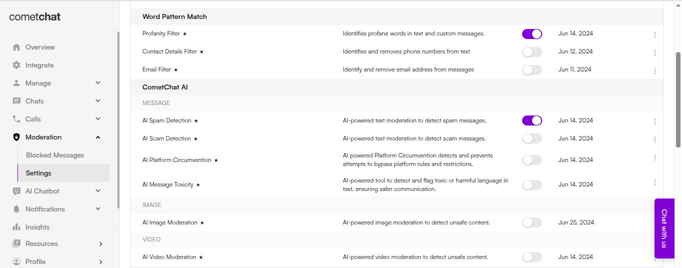 - Using the CometChat Dashboard — A simple, no-code interface for visually creating and managing moderation rules.