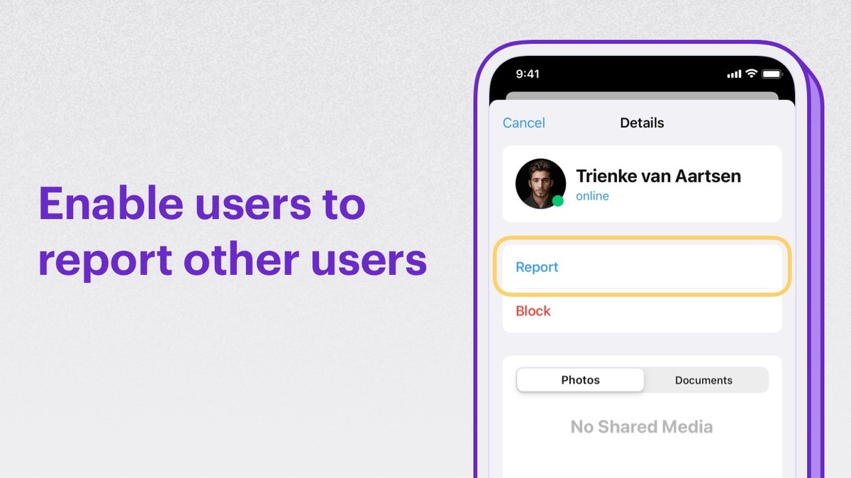 Users can be reported in either group conversations or one-on-one conversations. By clicking on the user’s avatar, you can show an item in the context menu called “Report”. Clicking on the “Report” button should open up a modal asking for the reason. Here’s the description of the parameters that need to be passed to the extension:| Parameters | Value | Description |