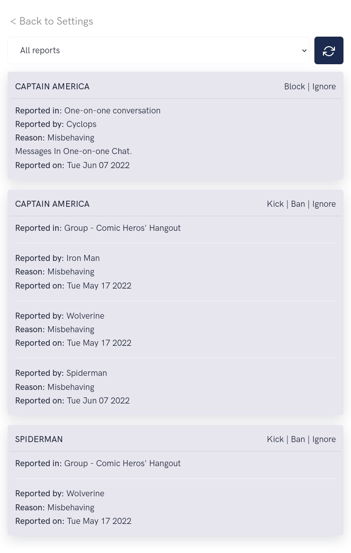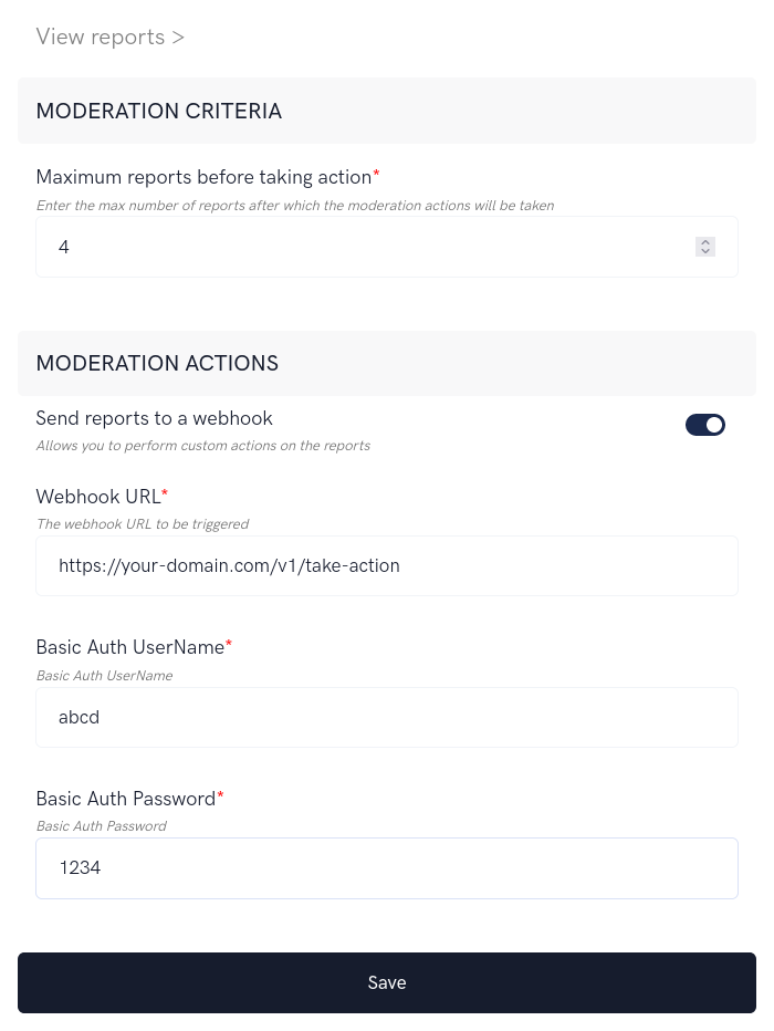 - Moderation actions: Get the list of reports on the configured Webhook URL.