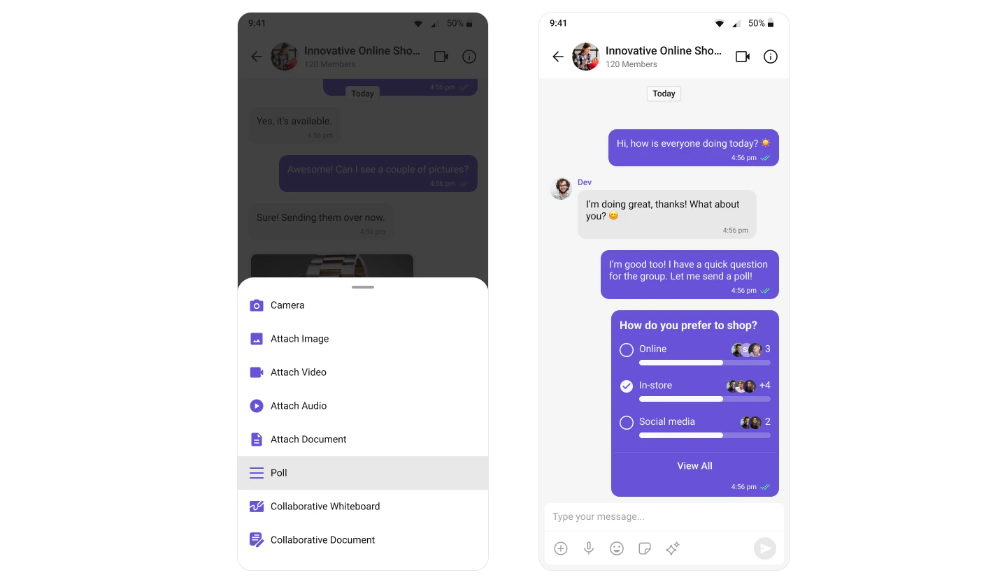 The Polls extension enhances group discussions by allowing users to create polls. Users can ask questions with a predefined list of answers, enabling a quick, organized way to gather group opinions. For a comprehensive understanding and guide on implementing and using the Polls Extension, refer to our specific guide on the Polls Extension. Once you have successfully activated the Polls Extension from your CometChat Dashboard, the feature will automatically be incorporated into the Action Sheet of the Message Composer component of UI Kits.