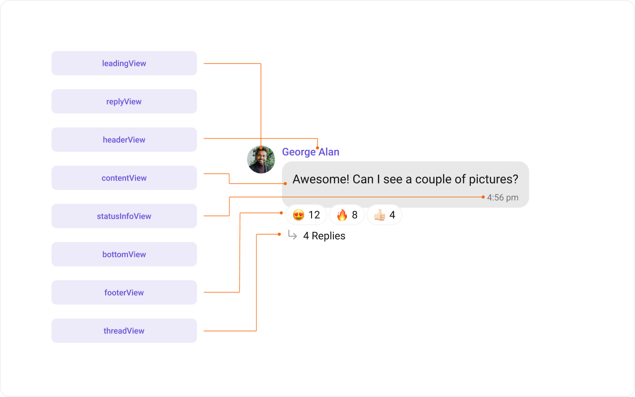 - Bottom view: This view can be used to extend the MessageBubble with additional elements, such as link previews or a ‘load more’ button for long messages. It’s typically placed beneath the Content view.