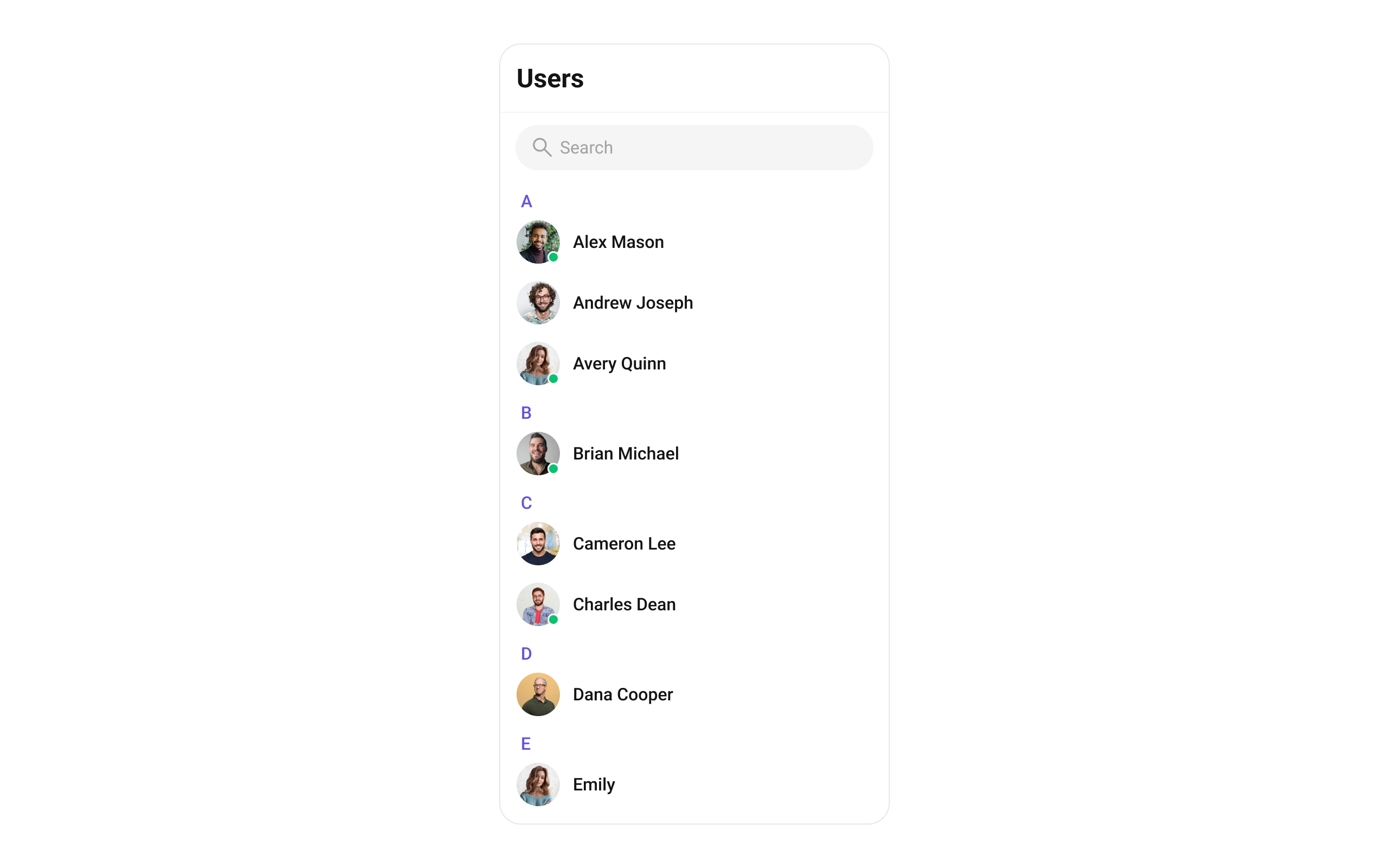 The Users is a Component, showcasing an accessible list of all available users. It provides an integral search functionality, allowing you to locate any specific user swiftly and easily. For each user listed, the widget displays the user’s name by default, in conjunction with their avatar when available. Furthermore, it includes a status indicator, visually informing you whether a user is currently online or offline.