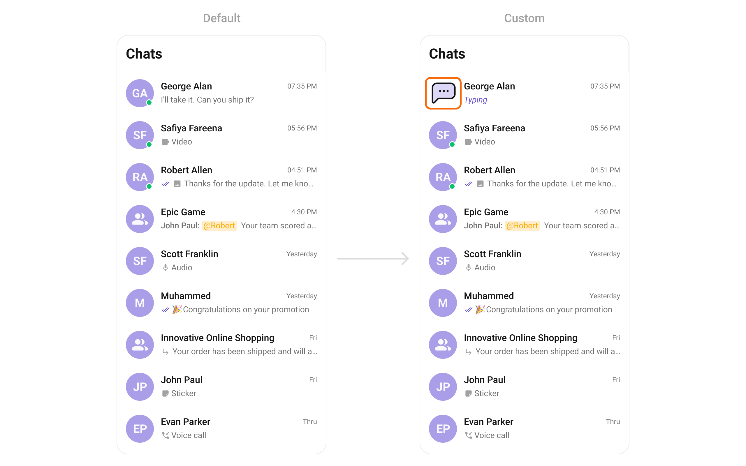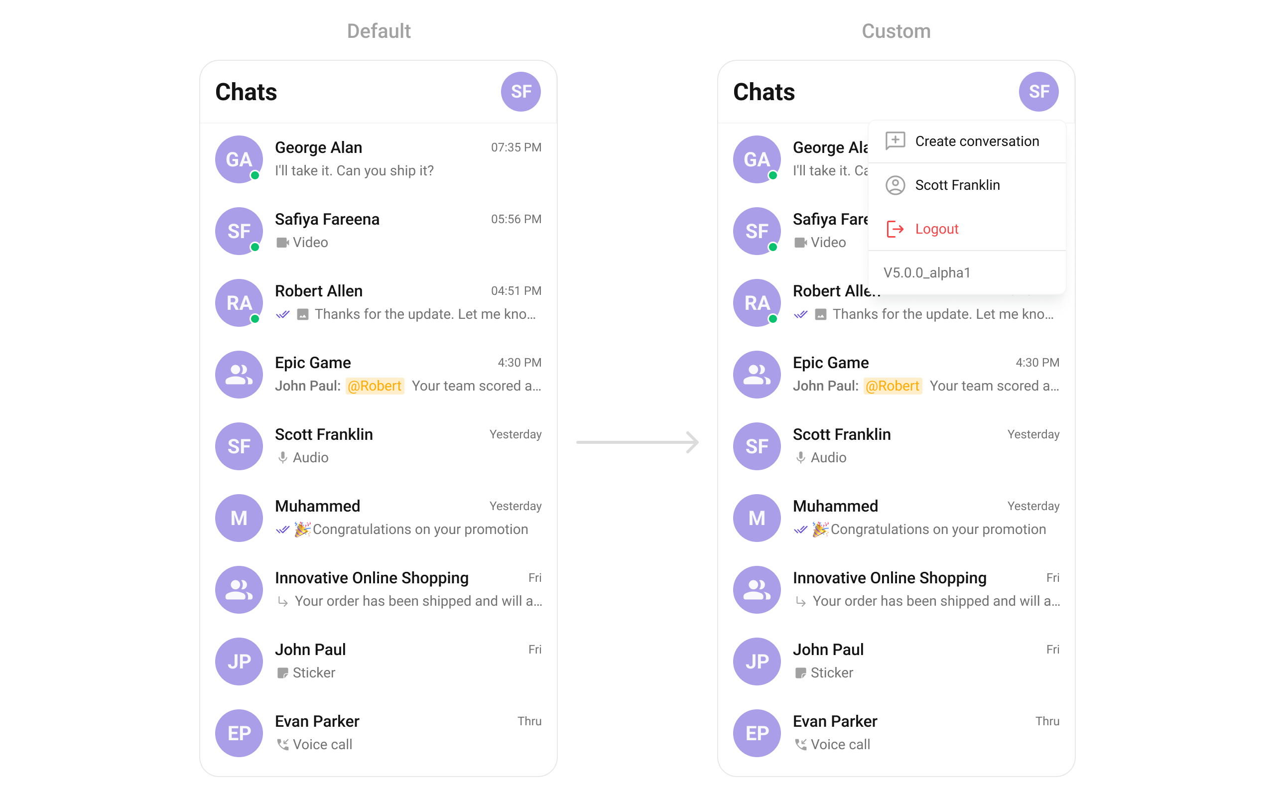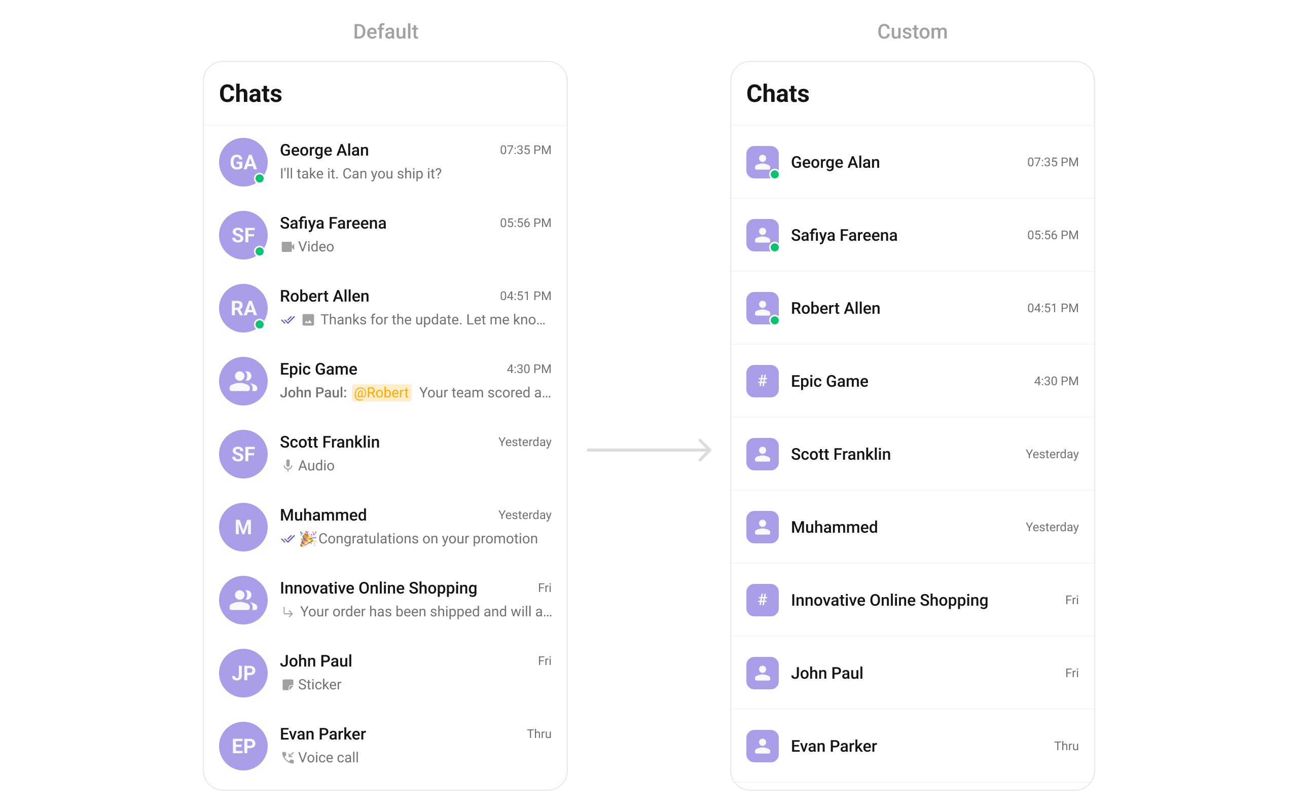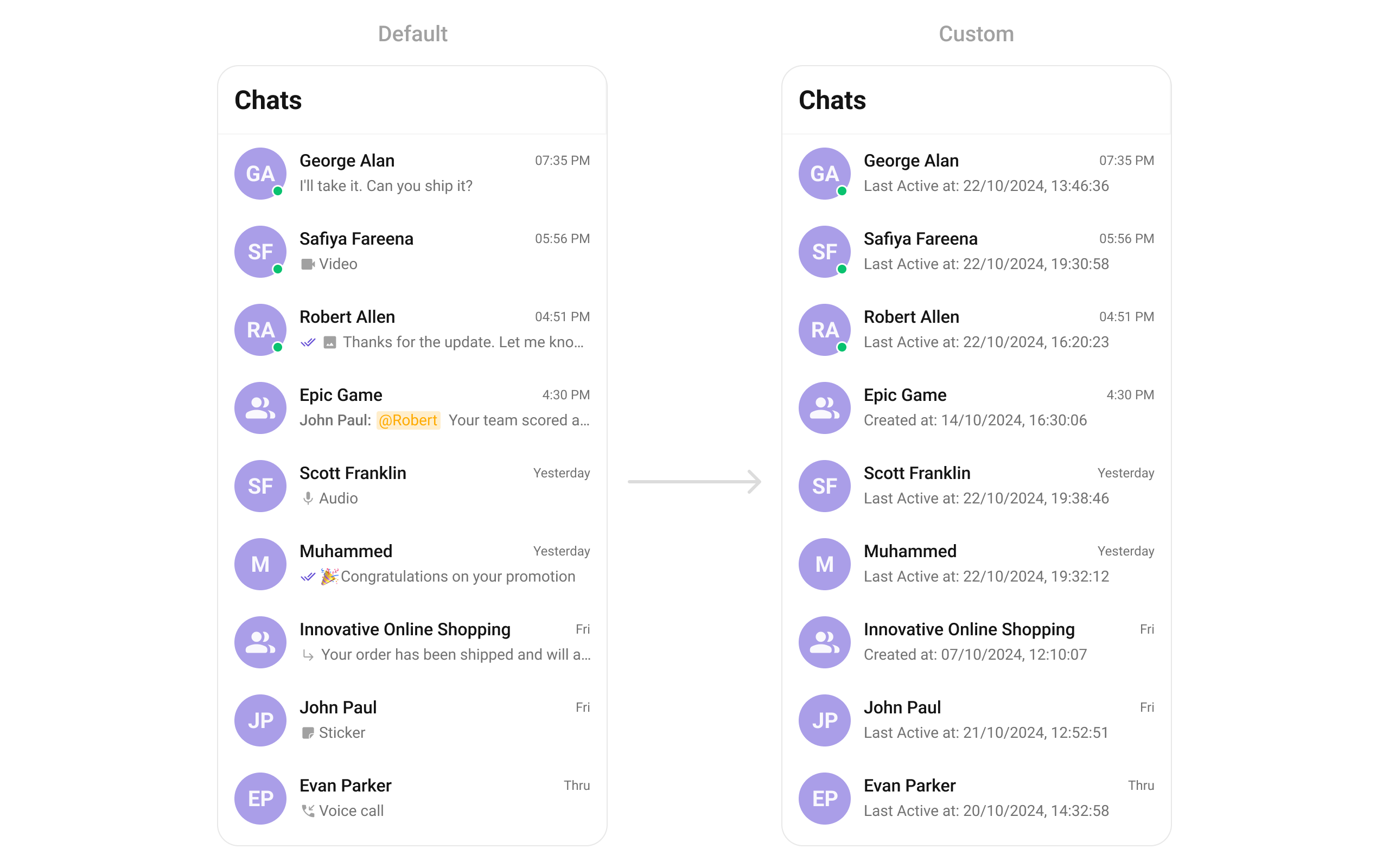 Overrides the default title view in the conversation list with a custom layout. This is useful for branding or modifying how conversation names and details are displayed. Use cases :- Displaying conversation titles with additional metadata (e.g., last seen time)