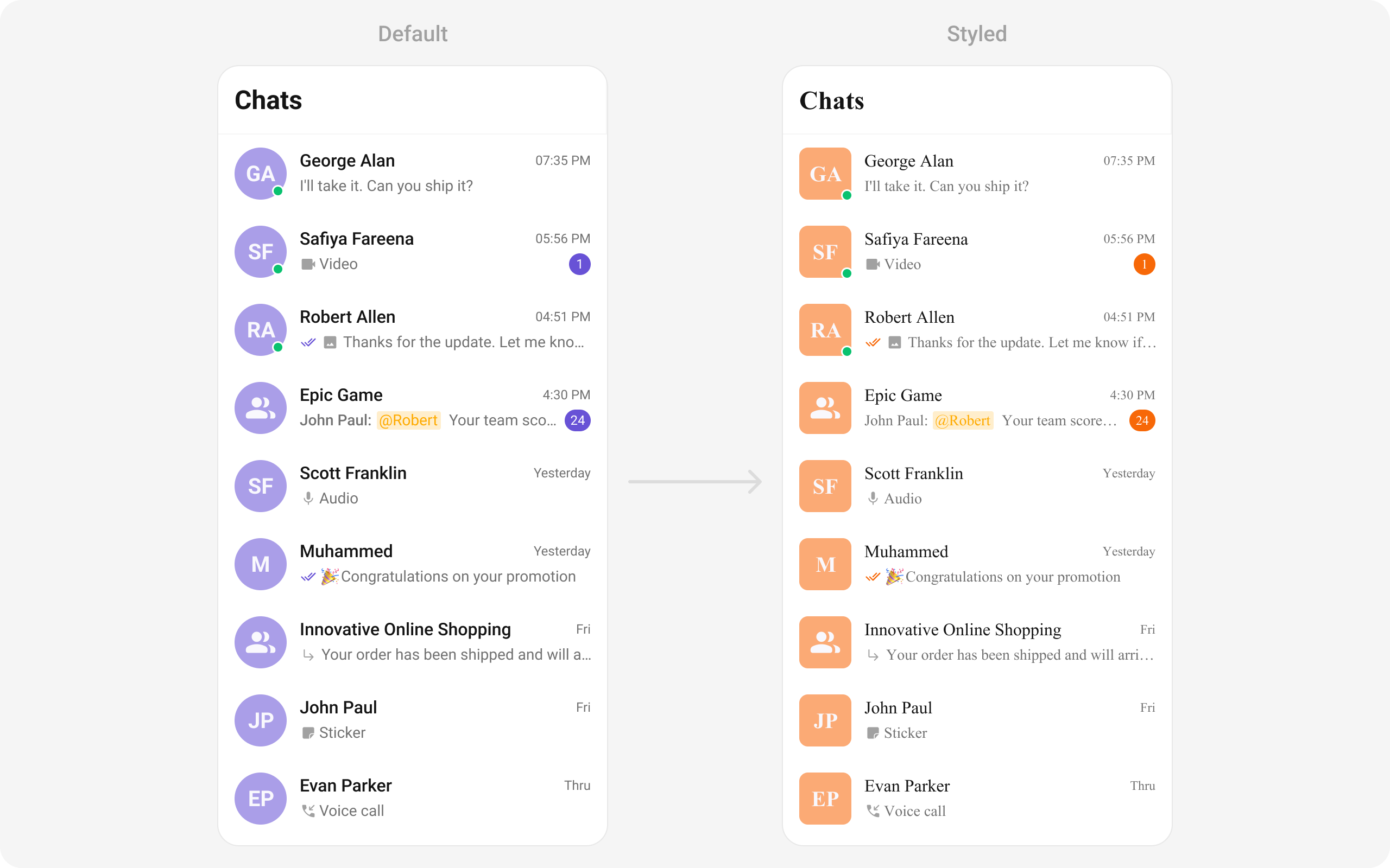 | Status Indicator Border Radius | Provides border radius for the user/group status indicator | statusIndicatorBorderRadius: BorderRadiusGeometry |