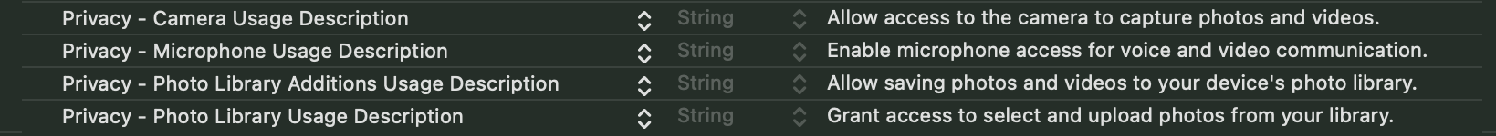 Info.plist. These permissions are required for sending and receiving media files.Info.plist