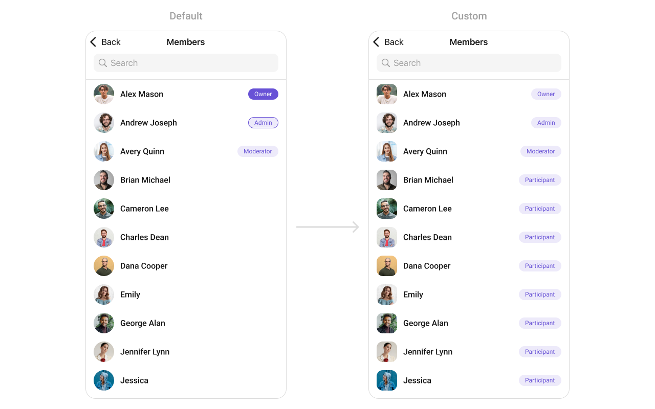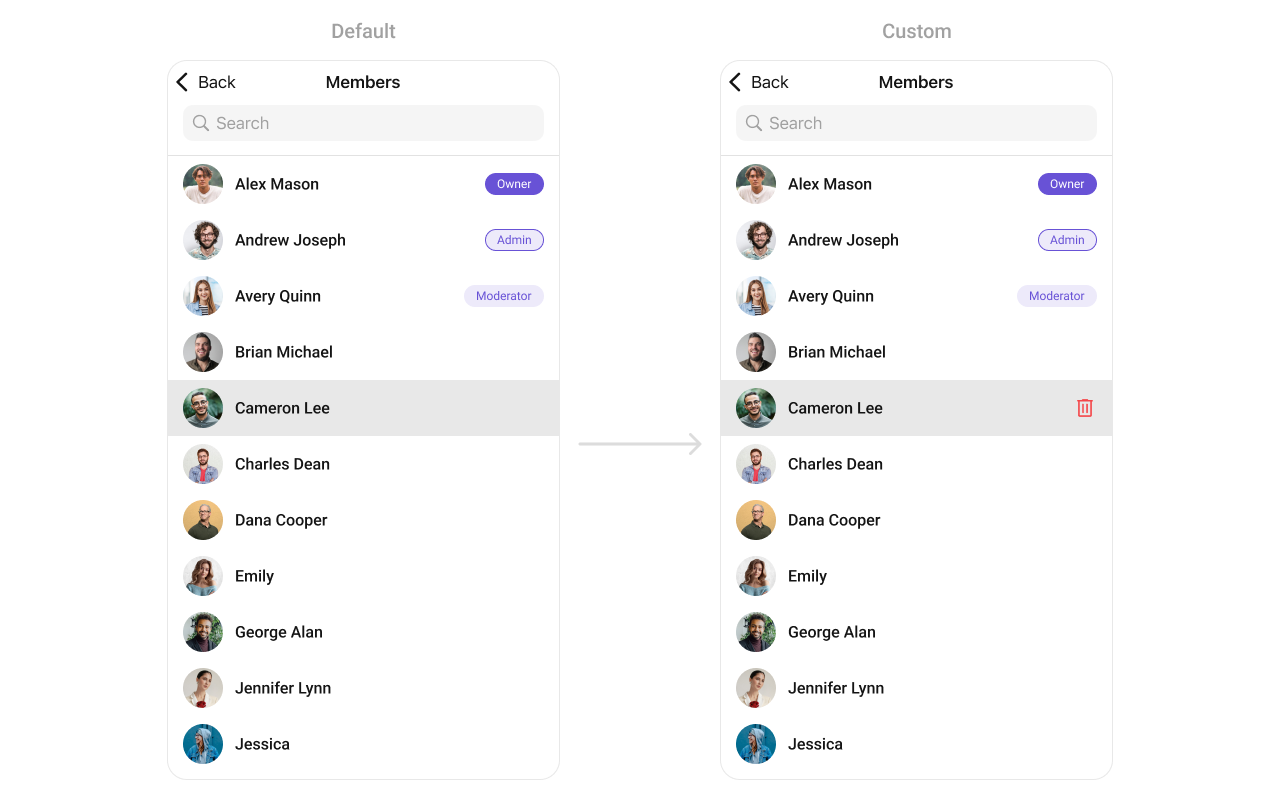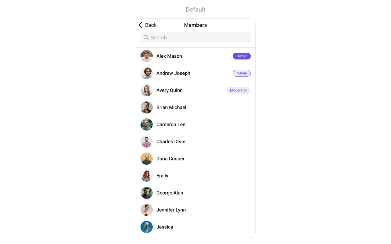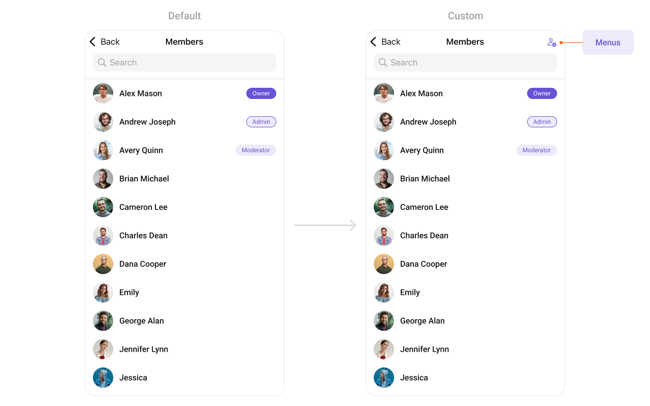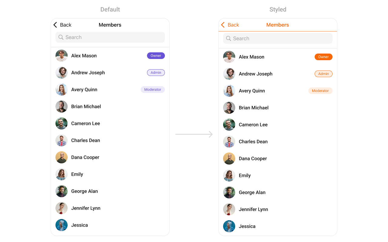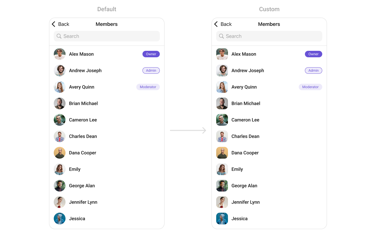 To fit your app’s design requirements, you can customize the appearance of the Groups component. We provide exposed methods that allow you to modify the experience and behavior according to your specific needs.Style