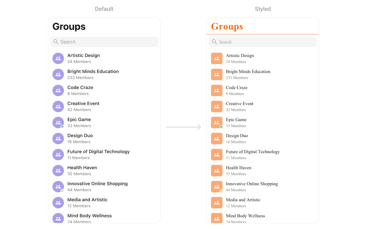 To fit your app’s design requirements, you can customize the appearance of the groups component. We provide exposed methods that allow you to modify the experience and behavior according to your specific needs.Style