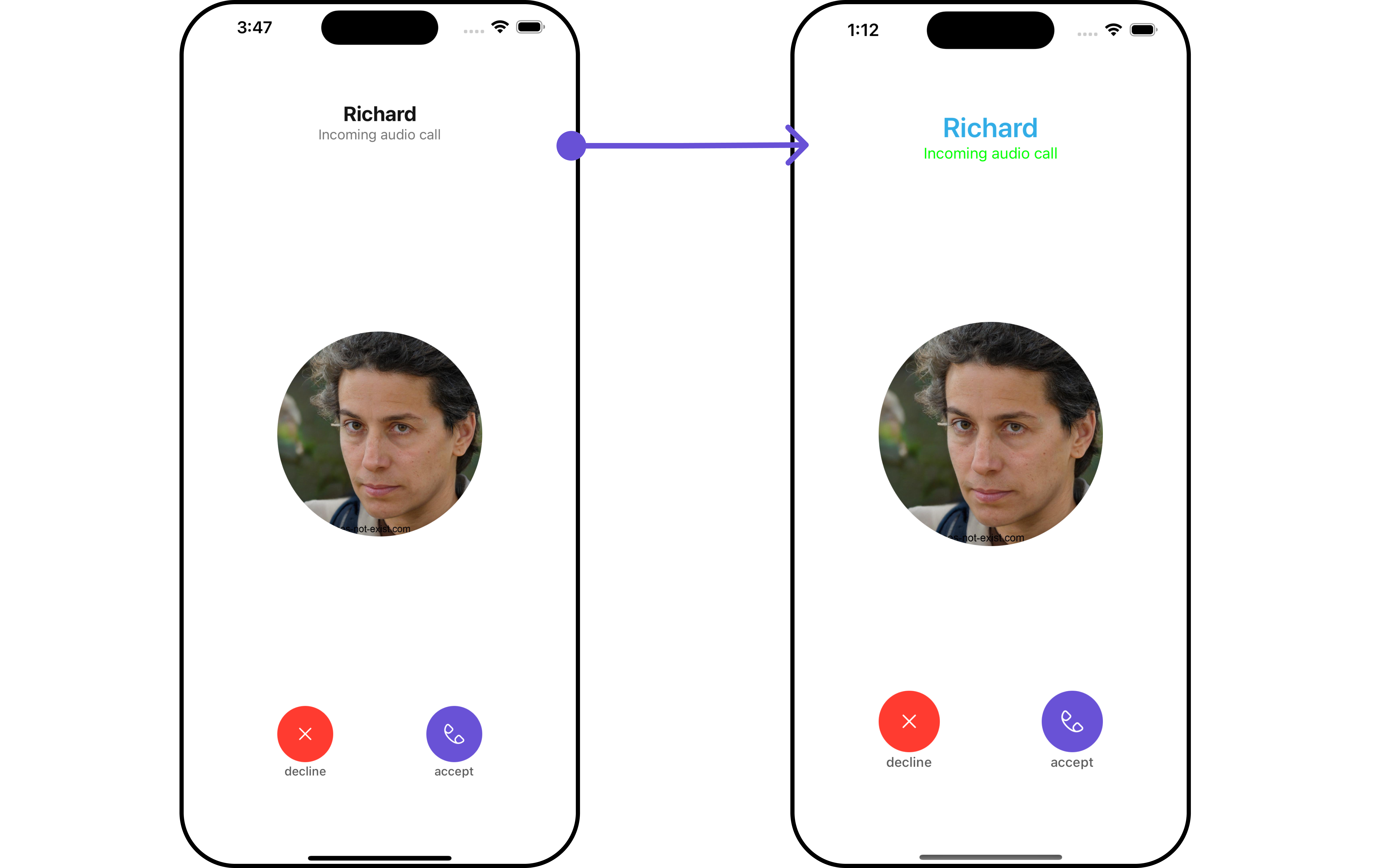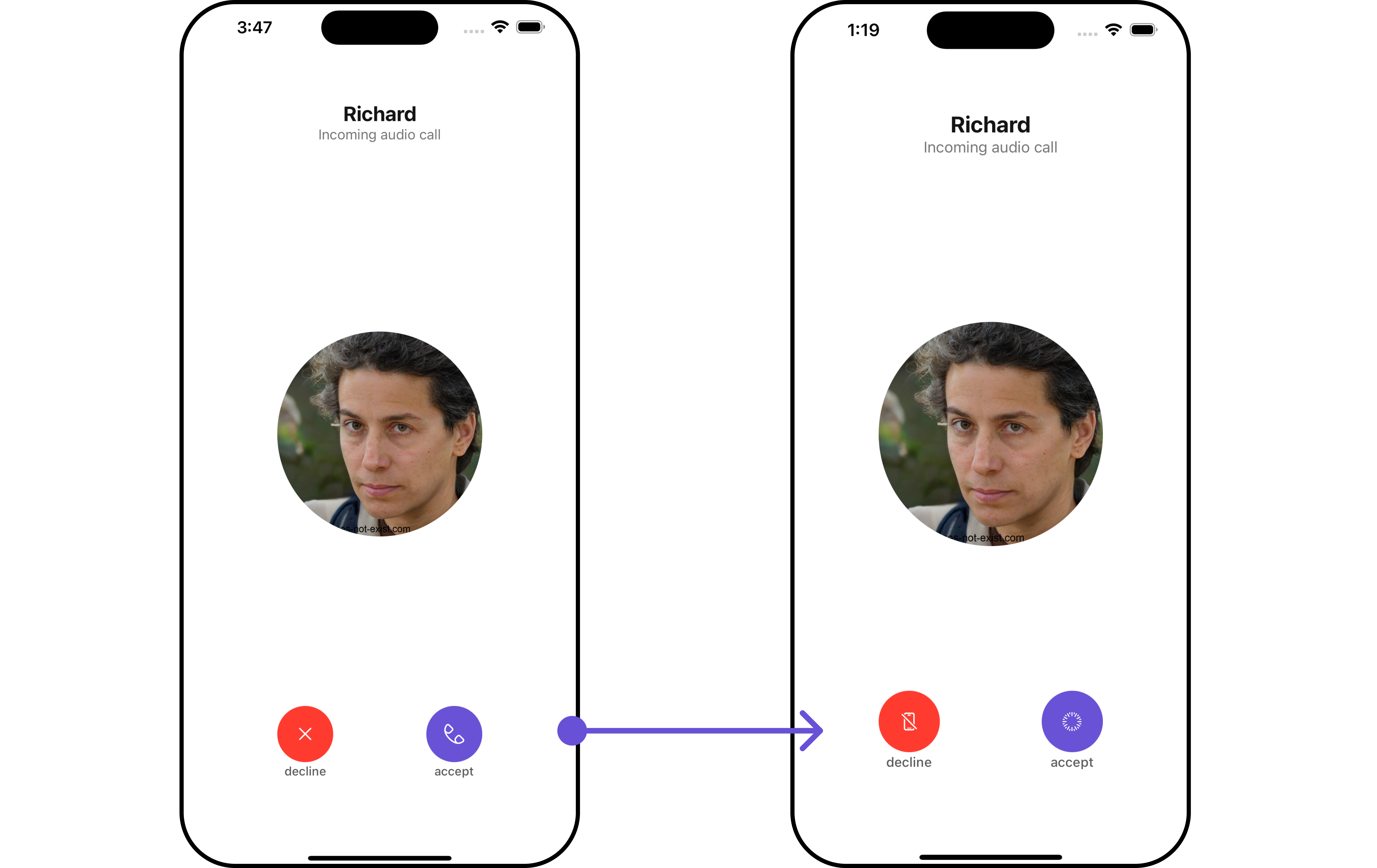 These are a set of small functional customizations that allow you to fine-tune the overall experience of the component. With these, you can change text, set custom icons, and toggle the visibility of UI elements. Example In this example, we’re enhancing the interface by customizing the accept and decline button icons. By setting custom icons for both the accept and decline buttons, users can enjoy a more visually appealing and personalized experience. This level of customization allows developers to tailor the user interface to match the overall theme and branding of their application.